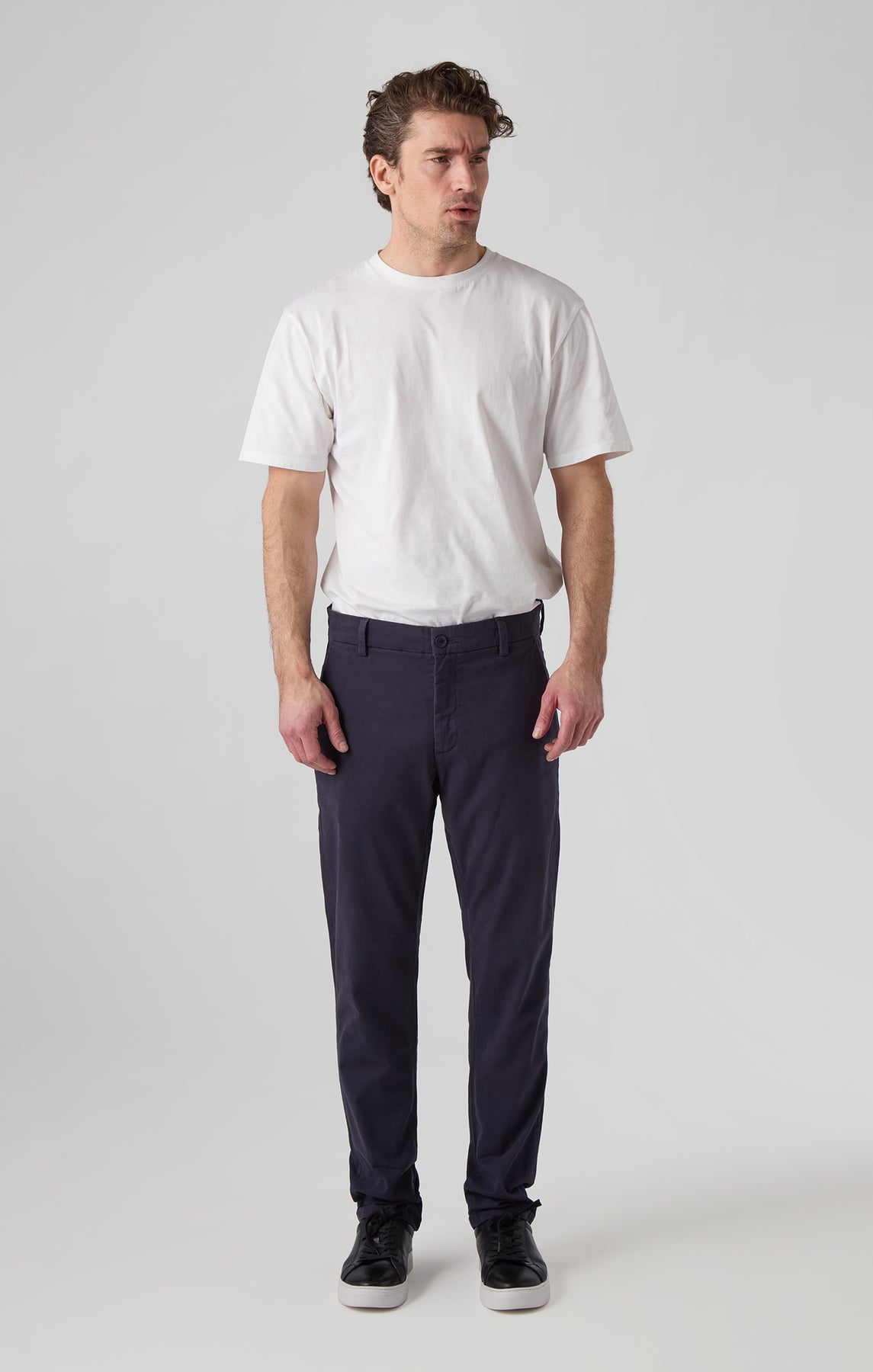Russel - Navy offers a classic chino fit with a modern slim straight leg design, crafted from stretchy brushed fabric for exceptional comfort and flexibility. This versatile pair combines timeless style with a subtle stretch, ensuring ease of movement throughout your day while maintaining a polished, professional appearance. Ideal for both casual and business settings, these chinos provide a refined look with lasting wear.